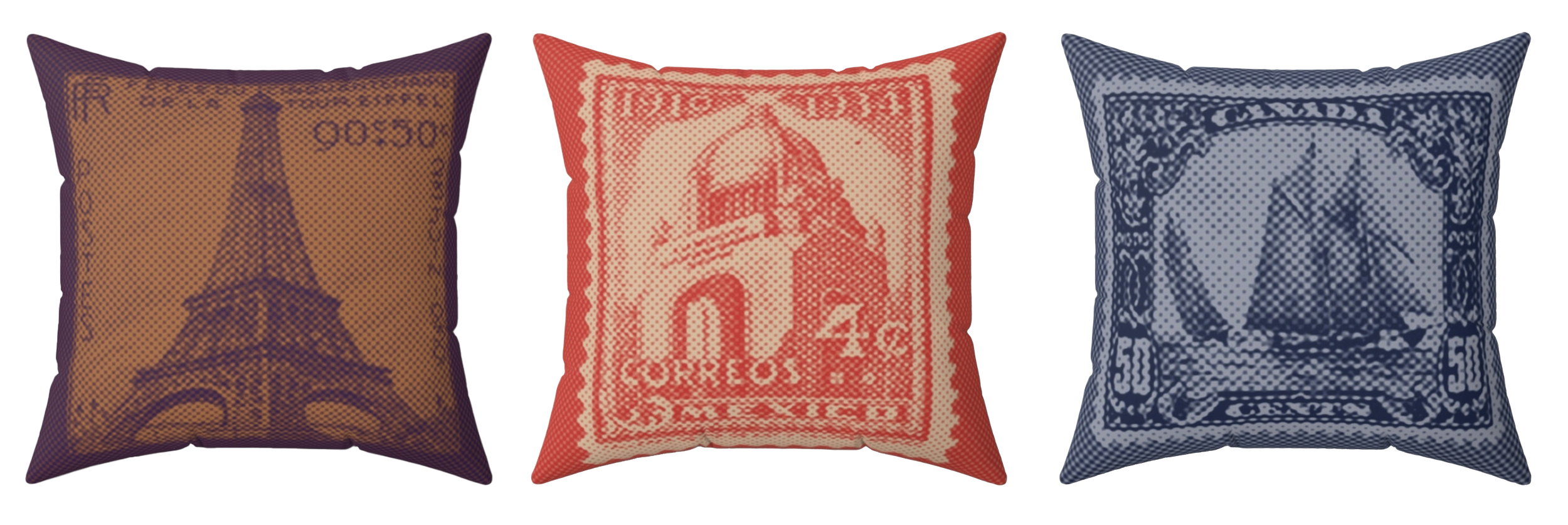 Stamp Collection Pillows are available in the Shop