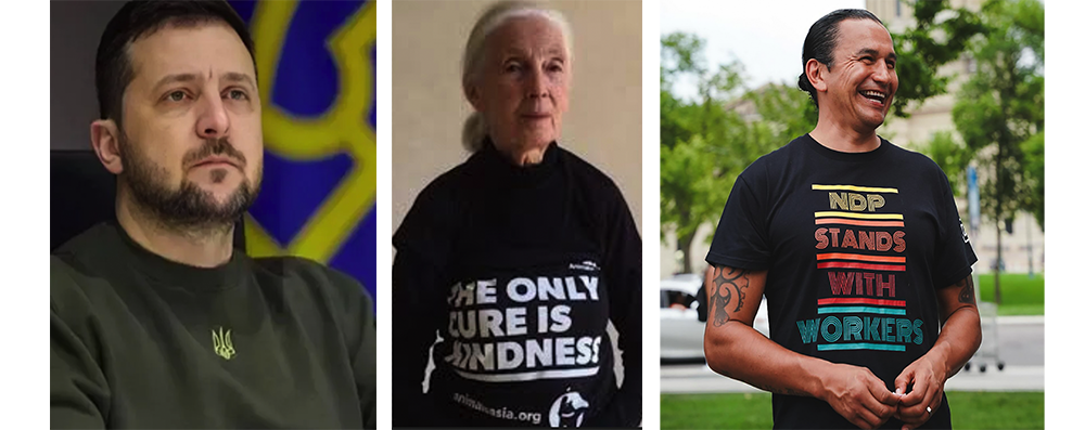 Today, many politicians and influential figures use the t-shirt as a simple, powerful way to communicate their message to the public. Ukrainian President Volodymyr Zelenskyy is known for his olive green t-shirt, a simple but powerful symbol of solidarity with Ukraine’s soldiers and people. It redefines leadership as presence and resilience, not formality. Jane Goodall, primatologist, anthropologist, UN Messenger of Peace, transformed how we understand animals with her groundbreaking work and determination. Her lifelong commitment to conservation continues to inspire compassion and respect for the natural world. Manitoba Premier Wab Kinew is a powerful voice for unity, resilience, and Indigenous leadership in Canada. His leadership and accessibility reflects integrity, cultural pride, and a commitment to building a more inclusive future. Canadian comedian, screenwriter, and film producer Mike Myers’s t-shirt speaks for a nation.