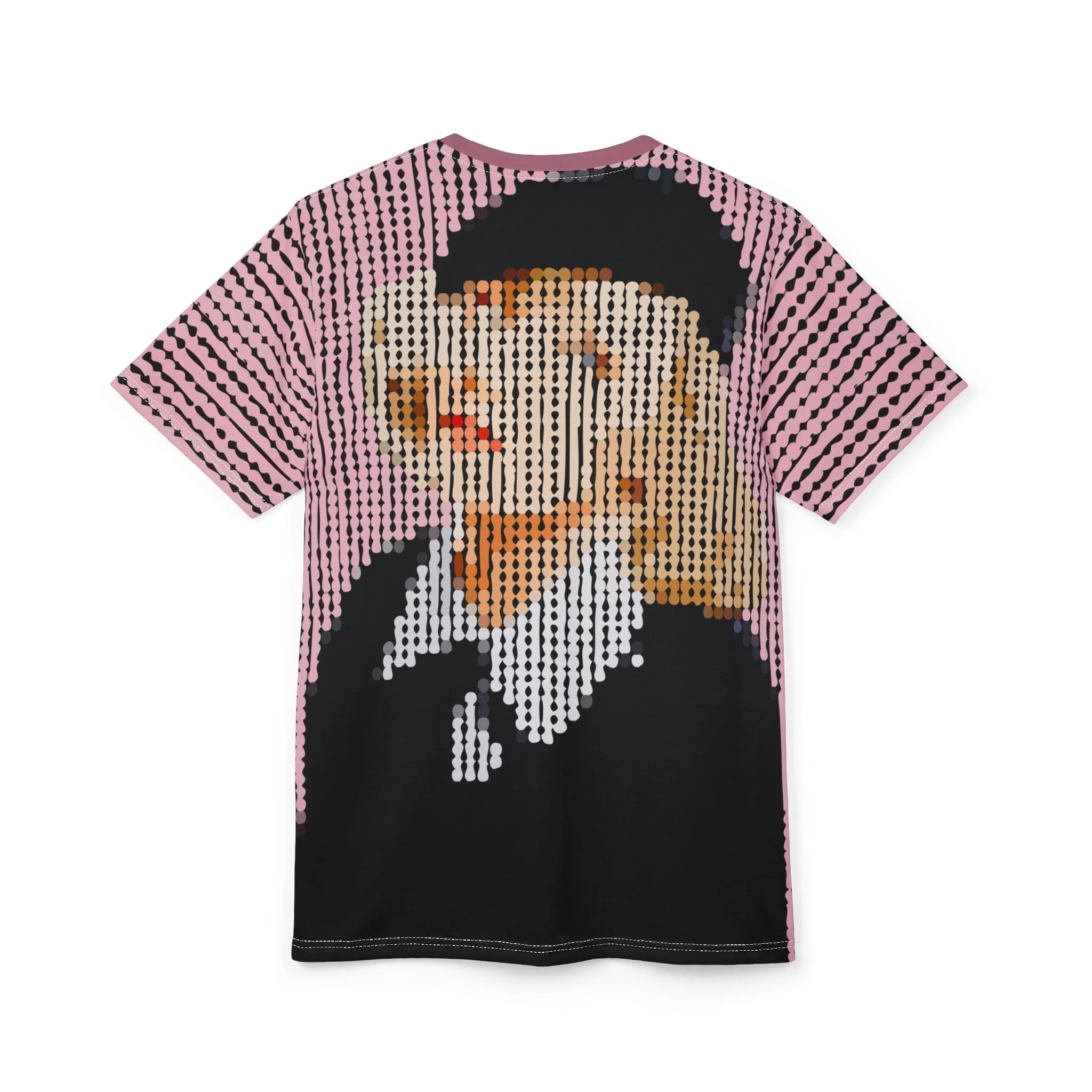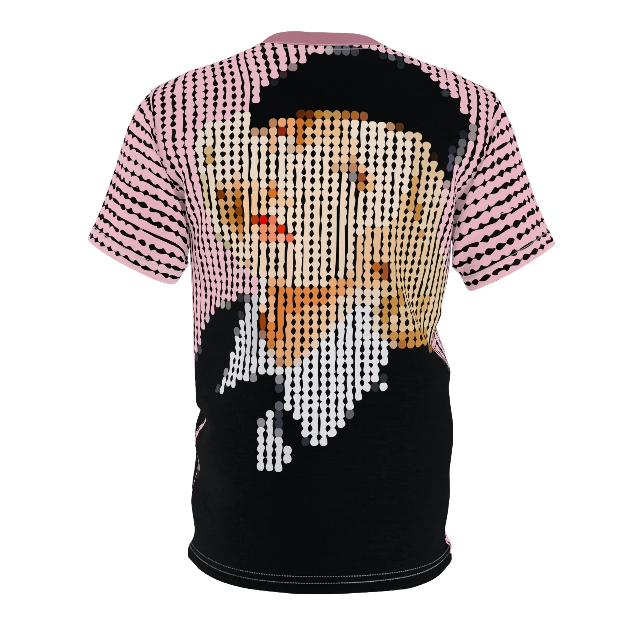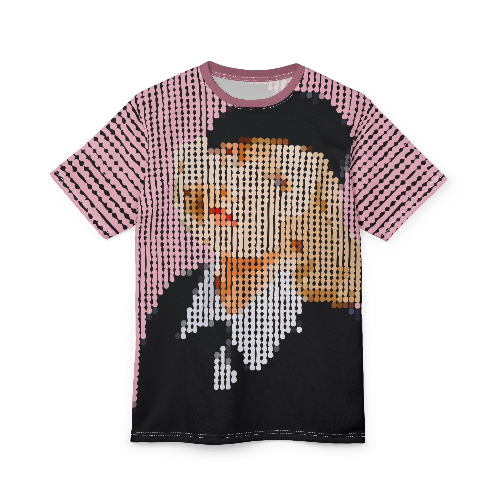 This all-over graphic tee reimagines Garbo’s iconic visage in a bold pixelated pop-art style. With soft pinks, warm tones, and a dramatic black backdrop, the design echoes both her elegance and her elusive mystique. More than just a t-shirt, it’s a tribute to a woman who embodied both strength and vulnerability on her own terms.