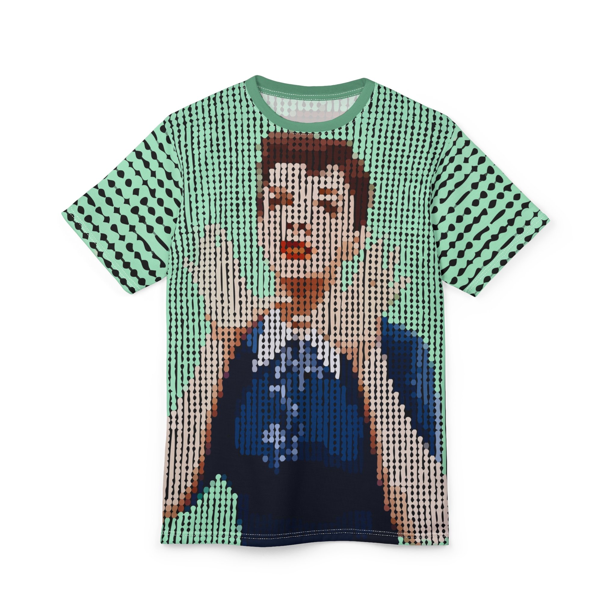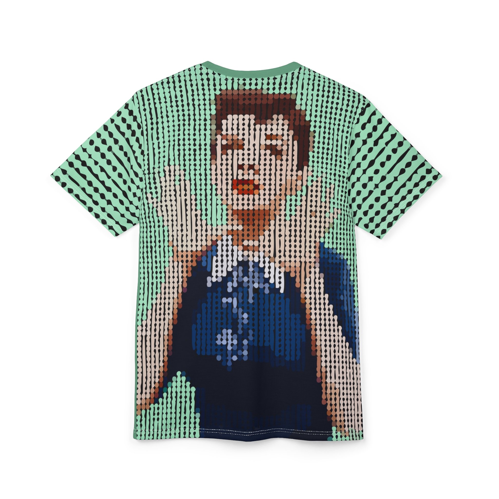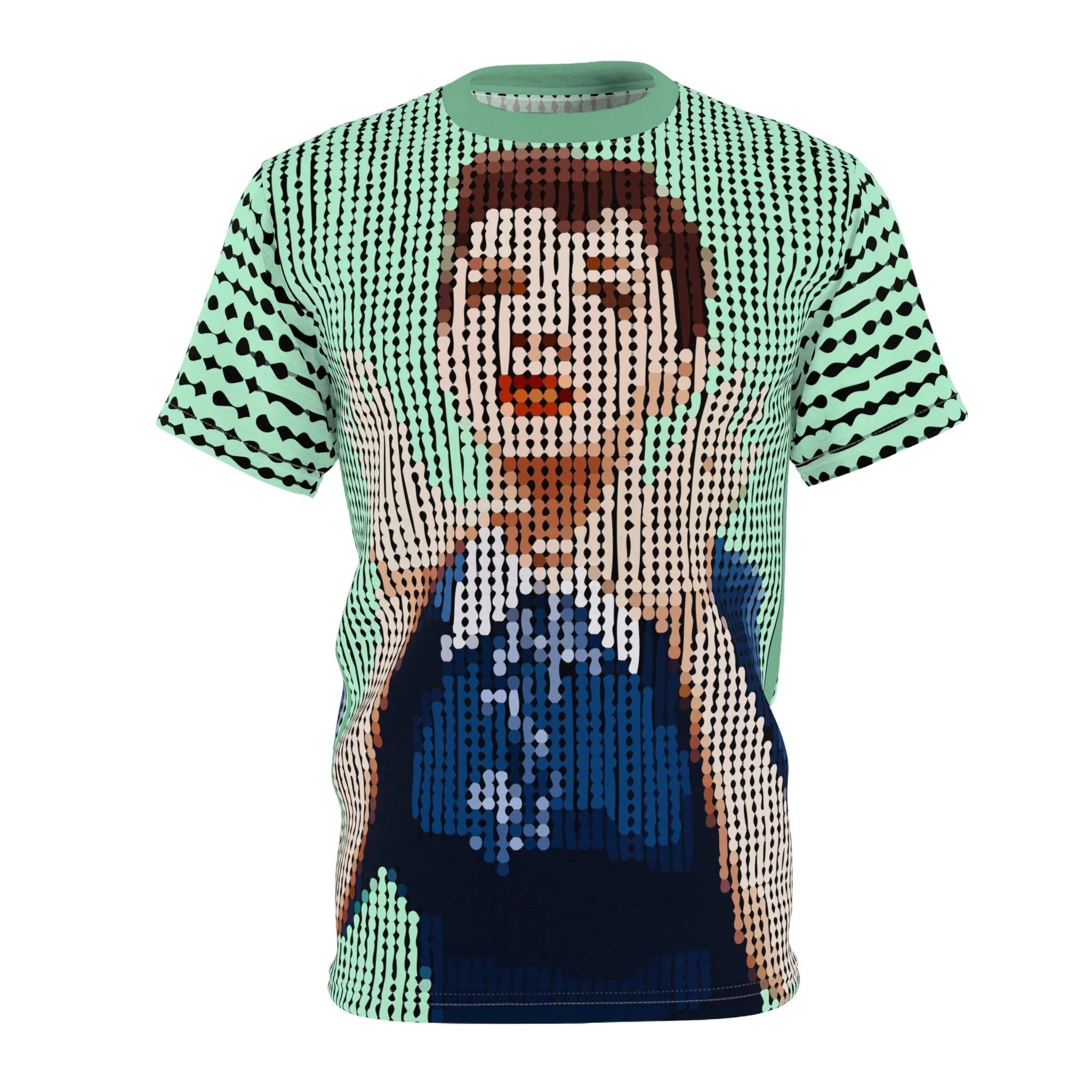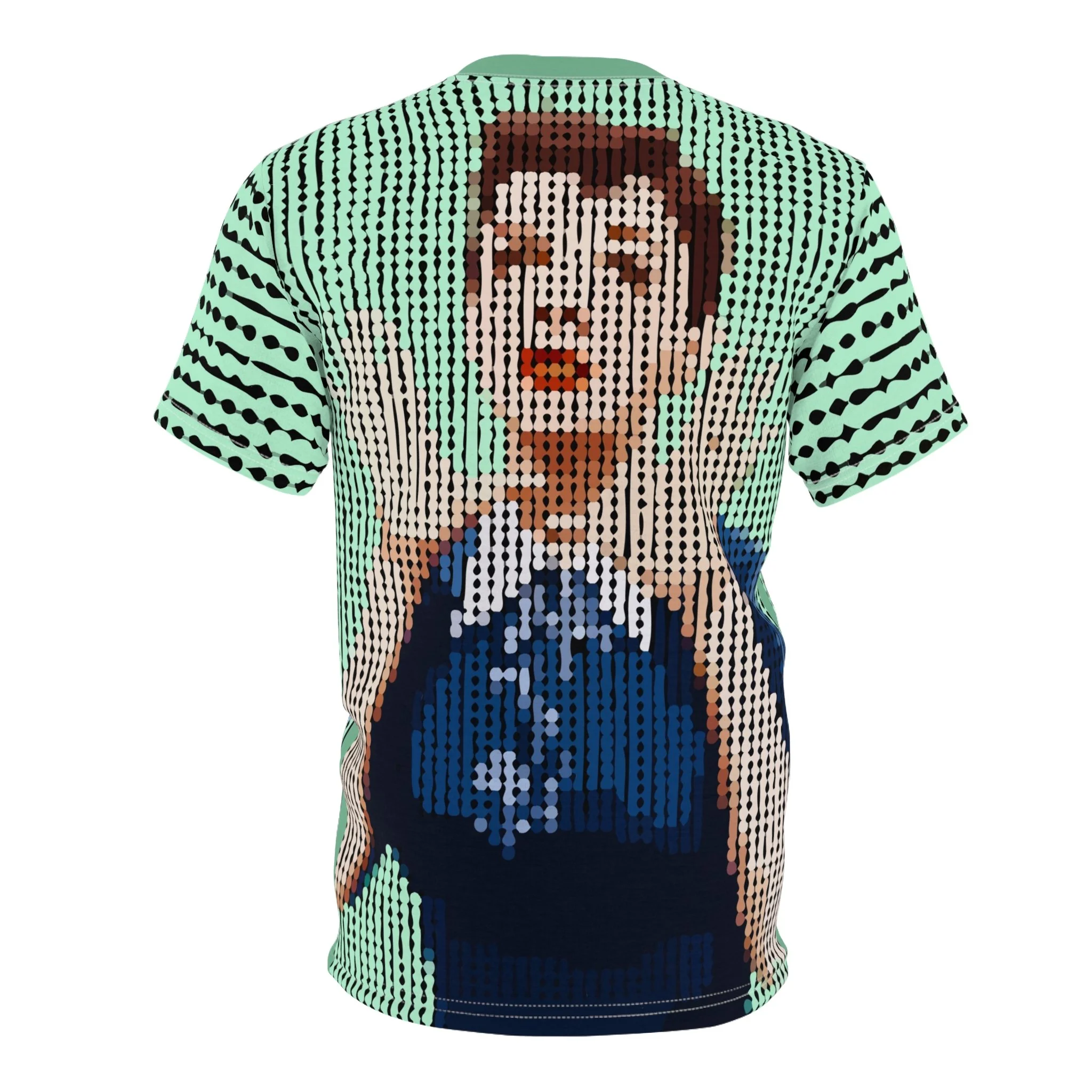 This all-over graphic tee reimagines Judy in a bold pixelated pop-art style, blending mint green, deep navy, and warm tones that echo both her timeless glamour and her emotional depth. It’s a wearable tribute to a woman whose artistry continues to inspire dreamers everywhere.